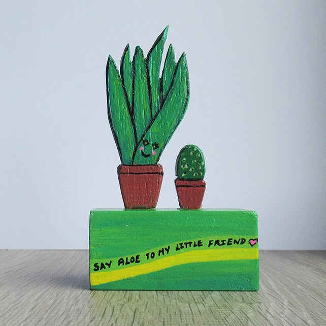 They stand on a rectangle wooden base with the text ‘SAY ALOE TO MY LITTLE FRIEND’ on its front side, over a green and yellow painted design.