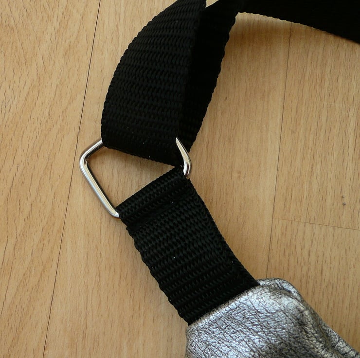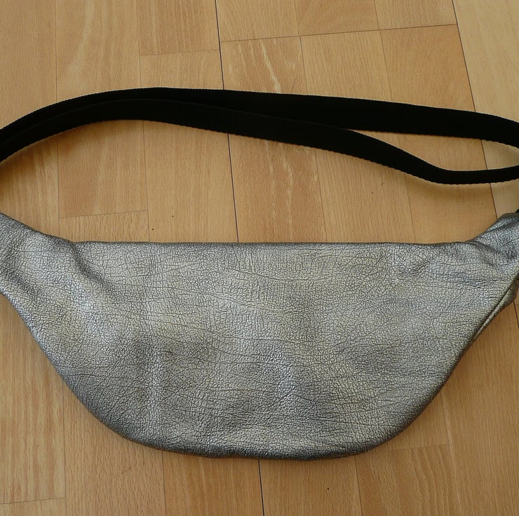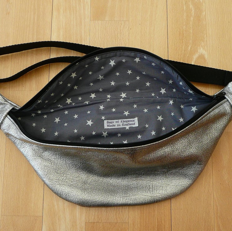 This bumbag has been made from top quality silver leather, its super soft yet firm enough to hold its shape, its fully lined in grey star print cotton and features one long zip on the front. The adjustable strap is 1" wide polypropylene webbing and featured a silver nickel slide sdjuster and loop. This version of the retro bumbag is made to be worn across the body, but you could wear it on the waist too ( size depending ).