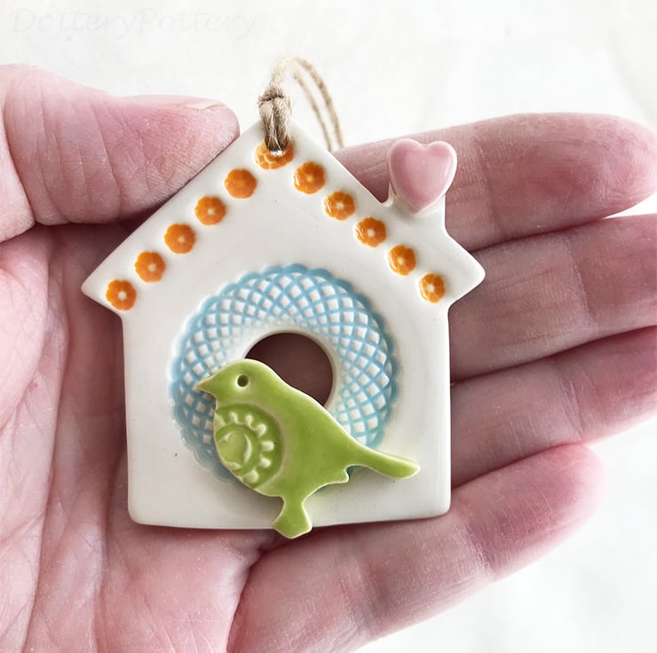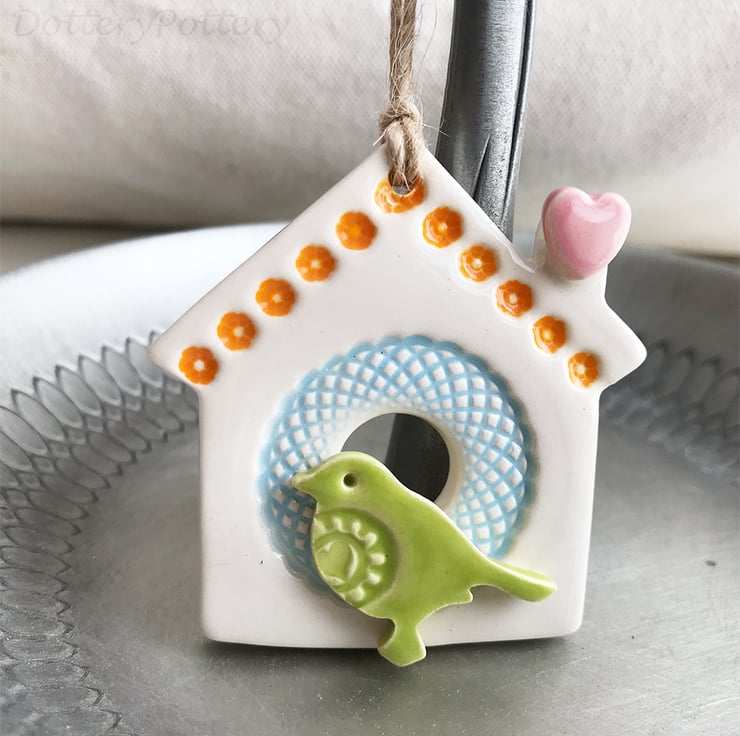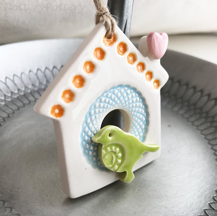 This little bird house decoration is made from white earthenware clay and finshed with a little pottery bird. It has been fired twice and finished with a glossy glaze for a lovely smooth finish. It measures 7.5 x 7cm and hangs from rustic brown string