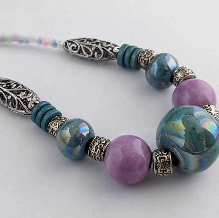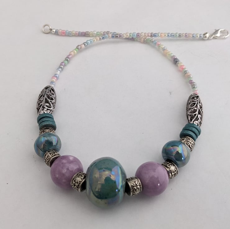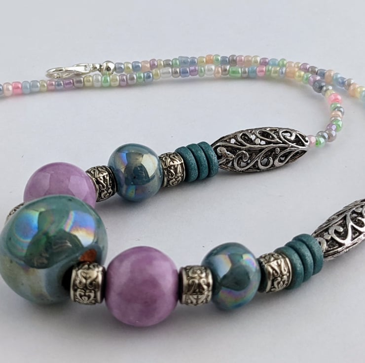 16" necklace of turquoise and lilac glazed ceramic beads (20mm to 14mm), Tibetan silver spacers and filigree oval beads, and pastel seed beads. In an organza gift bag.
