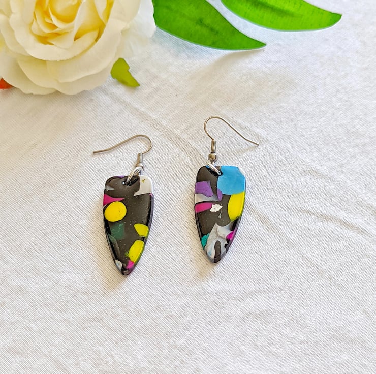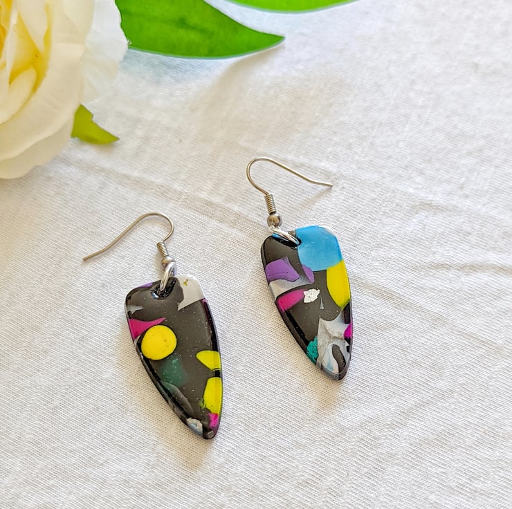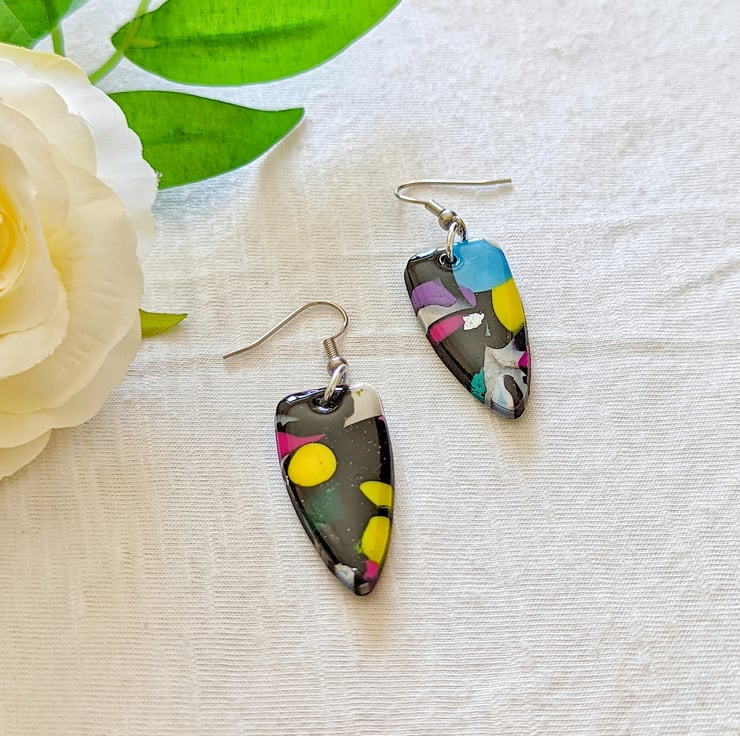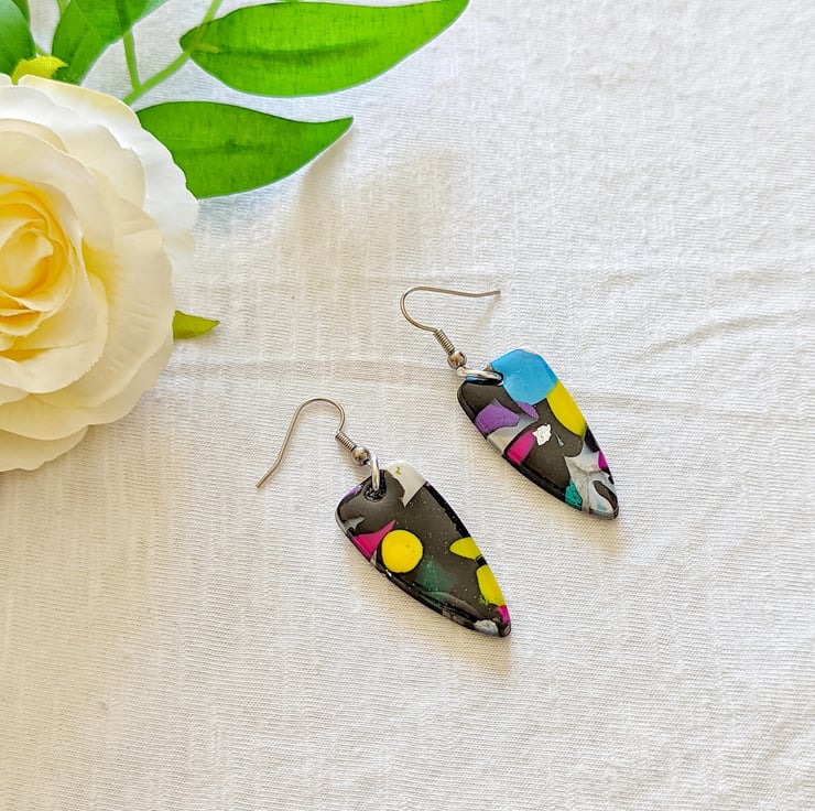 Black canvas with splodges of pink yellow blue green & white colour pops