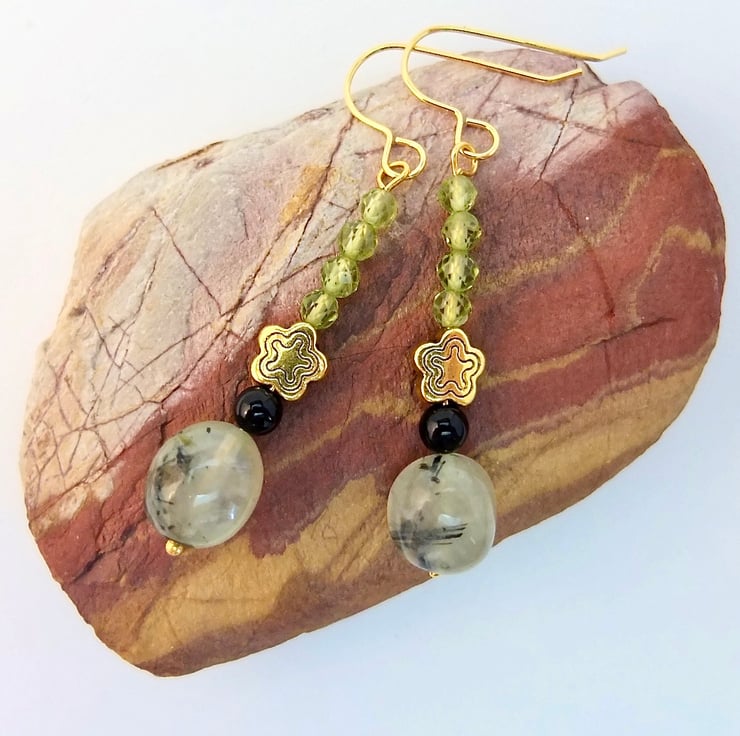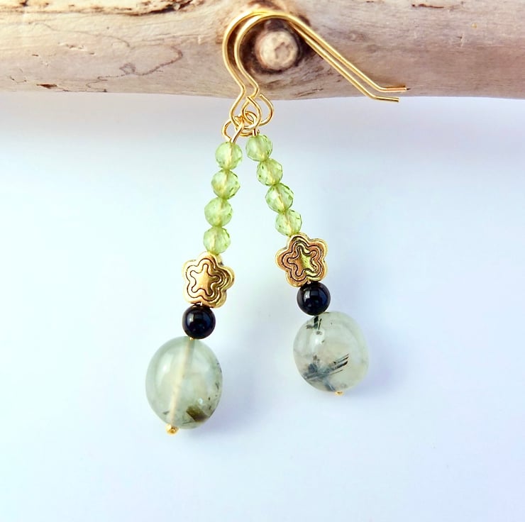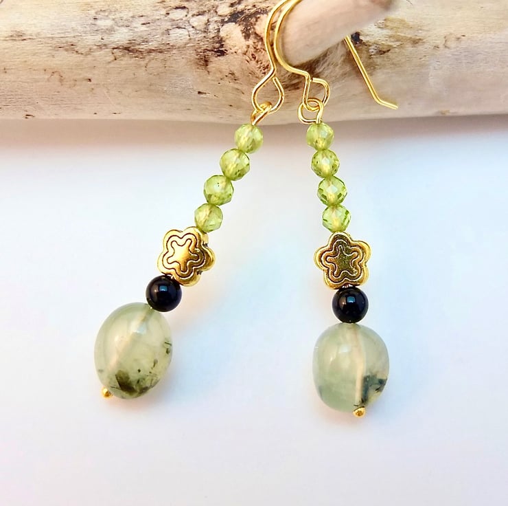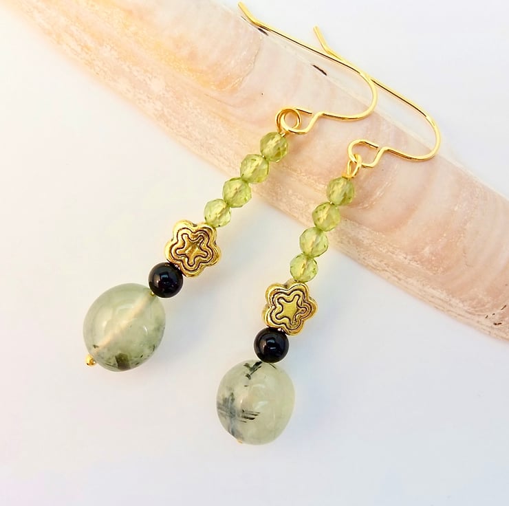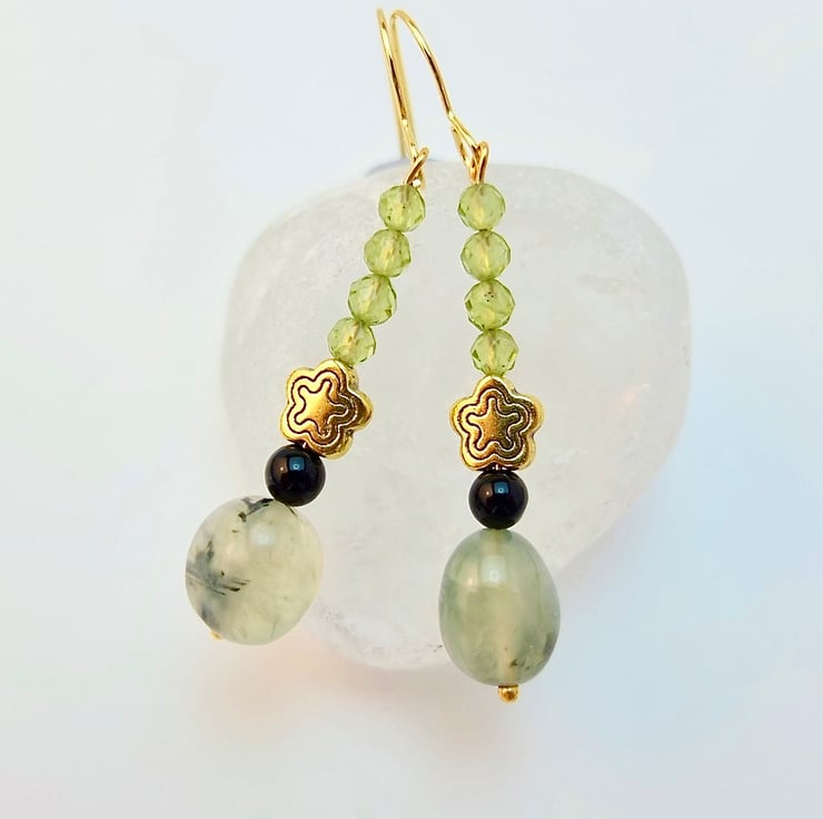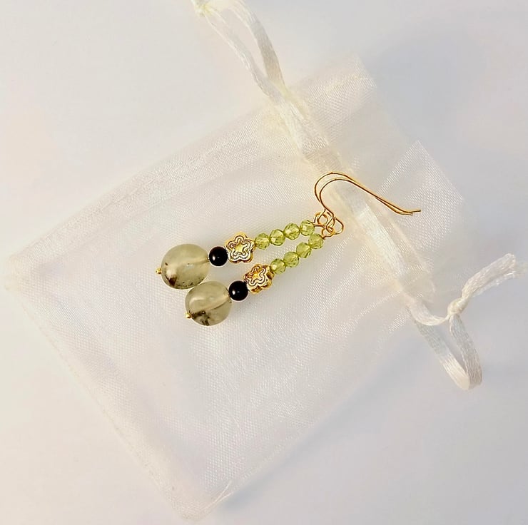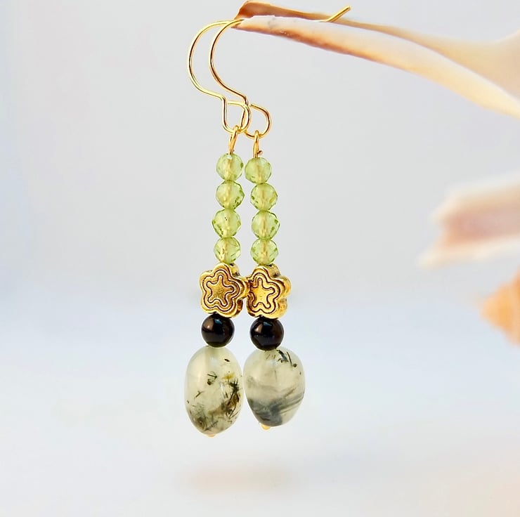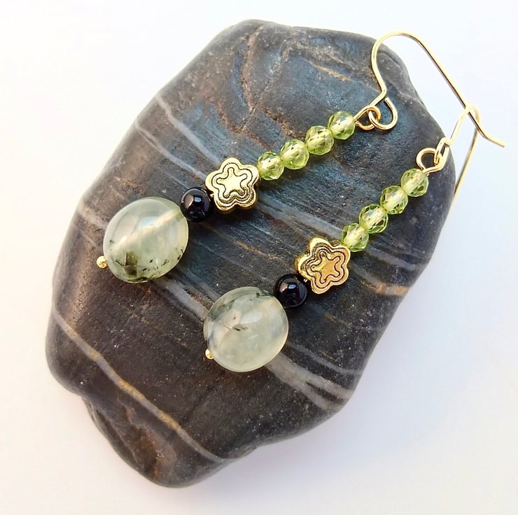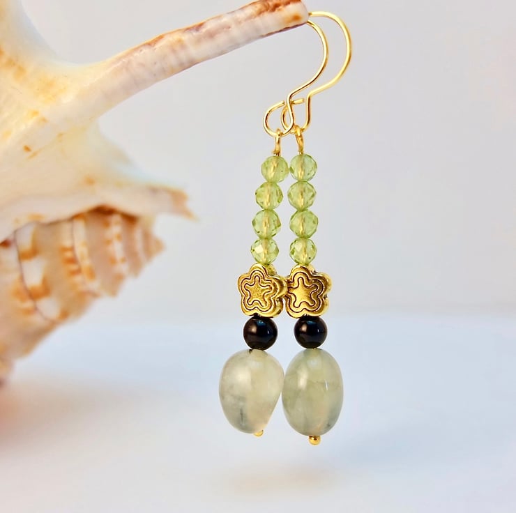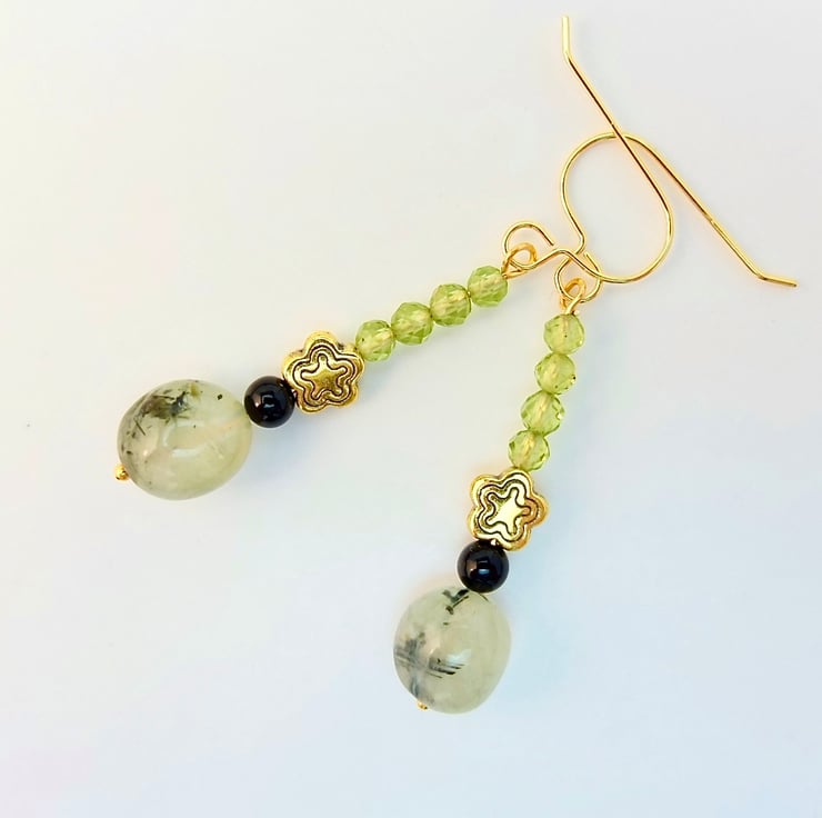 A semi-translucent, 8-10mm, milky mint green Prehnite nugget with black epidote inclusions is topped with a 4mm black Onyx bead, a 7mm, nickel and lead free Tibetan star and a row of four vibrant green, 3.5mm, multi-faceted AAA grade Peridot beads.
