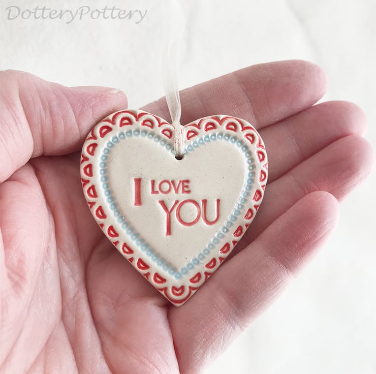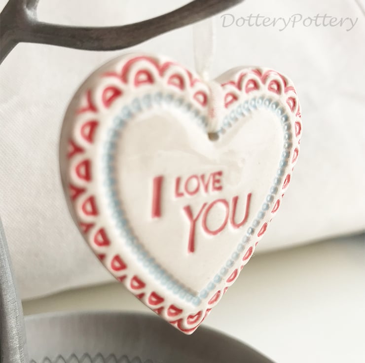 This little heart is made from white earthenware clay, imprinted with the words I Love You. It has been fired twice, once to the bisque stage and then a second firing for the clear glaze. It measures 4.5 centimetres wide x 5cm height x 5mm thick. It can be hung outside.