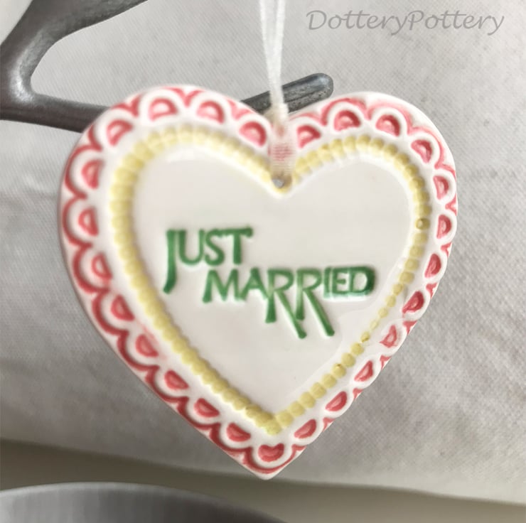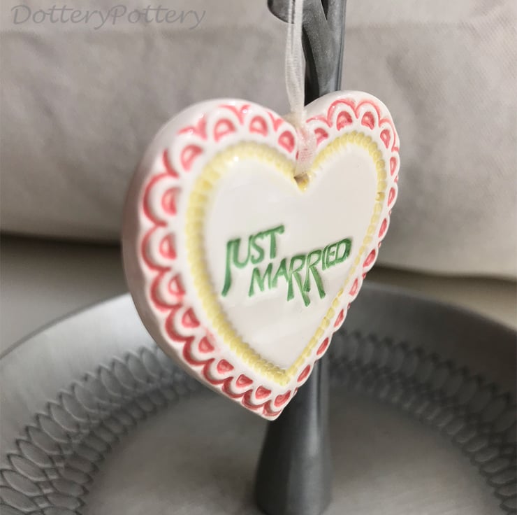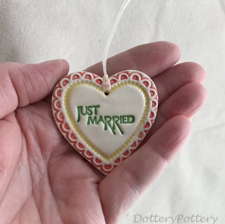 This little heart is made from white earthenware clay and imprinted with the words Just Married. It has been fired twice, once to the bisque stage and then a second firing for the clear glaze. It measures 4.5 centimetres wide x 5cm height x 5mm thick. It can be hung outside.