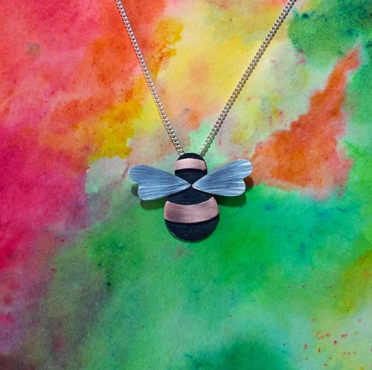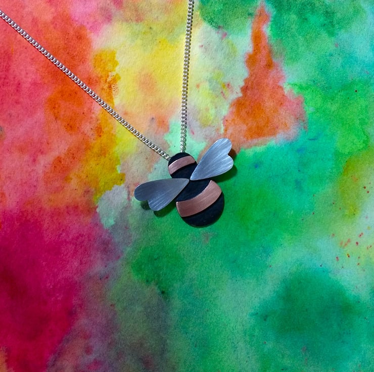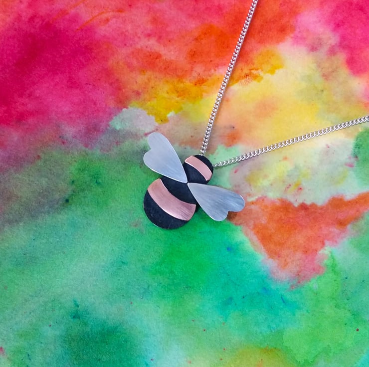 Handmade in our Yorkshire studio, this beautiful Bumble Bee Necklace/Pendant is made from Copper and has a dimple-textured oxidized body, with smooth Copper stripes and textured Sterling Silver wings. It has a concealed tube at the back which the Sterling Silver Curb Chain is threaded through (Please select your desired chain length at checkout). The Bee is created completely by hand and the textures are hand hammered so each Bee is unique.