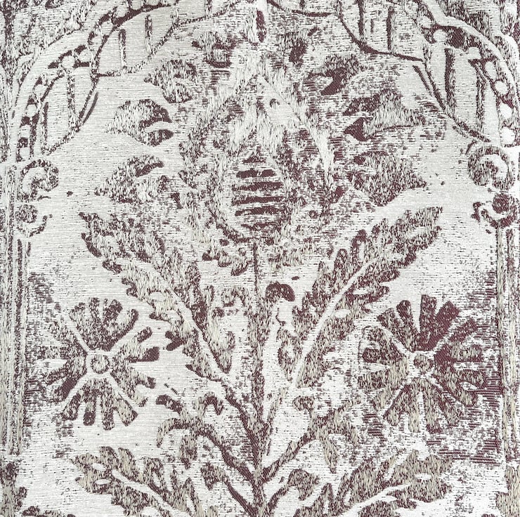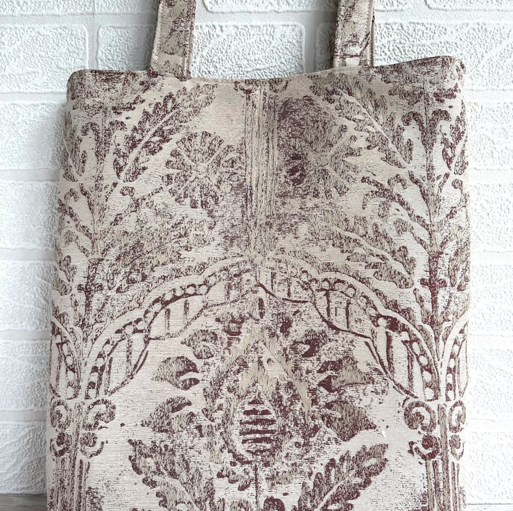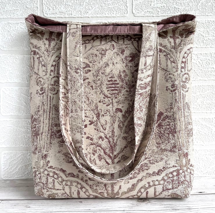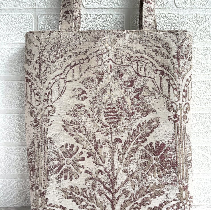 Art Nouveau abstract tote bag. This handy tote bag is made from a lovely brocade fabric in subtle shades of rose gold and dusky pink, with a slight sheen. The fabric features an unusual Art Nouveau style abstract pattern. The pattern depicts flowers and leaves on a stem, surrounded by a decorative arch supported by ornate columns. The bag is lined with crinkled satin fabric in dusky pink-purple.