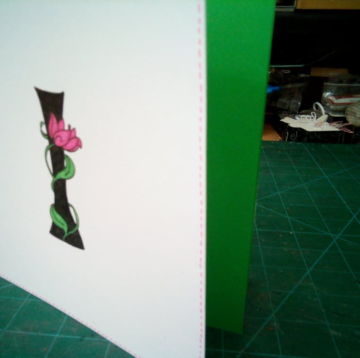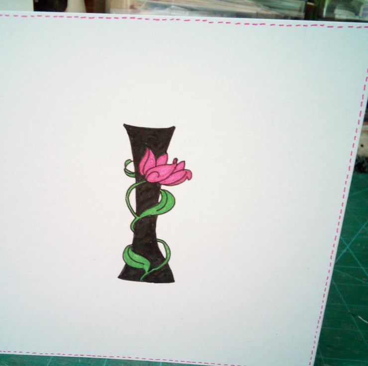 A completely handmade and uniquely designed card. Consisting of quality pristine white card which has had the letter I hand drawn in black ink. A beautiful lily wraps around the letter and hand coloured with glitter pens.