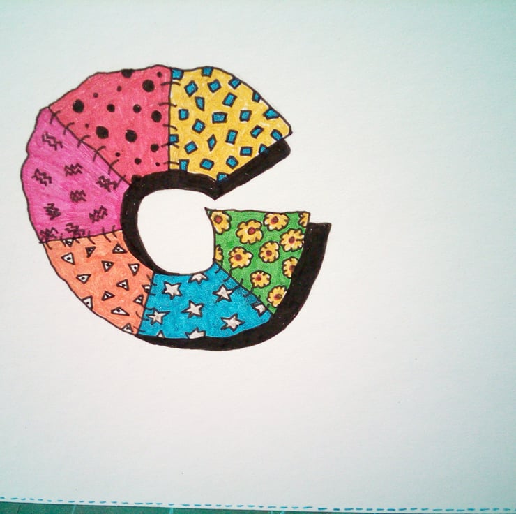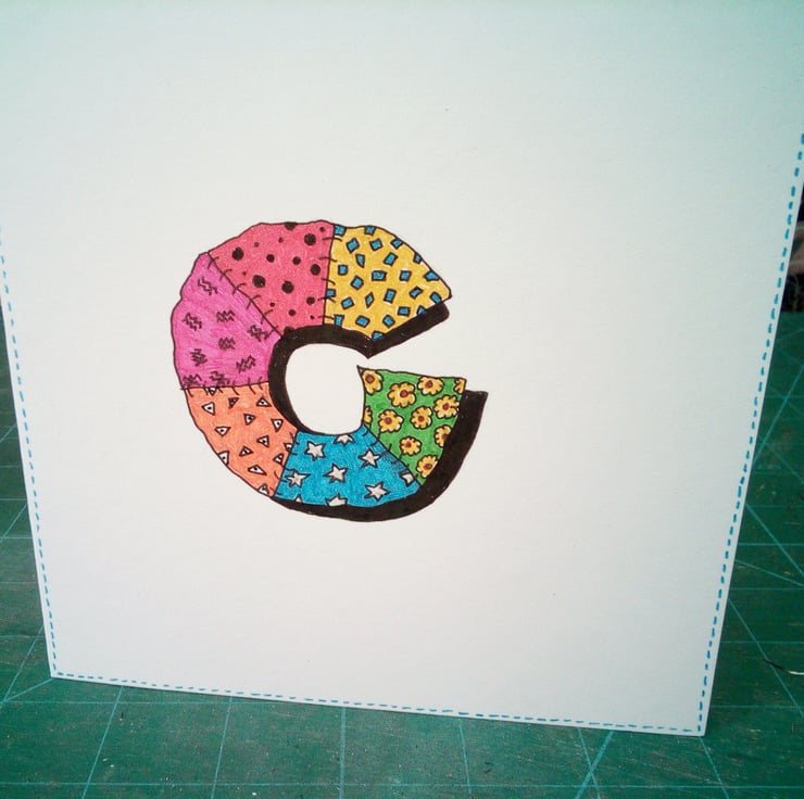 A completely handmade and uniquely designed card. Consisting of quality pristine white card which has had the letter G hand drawn in black ink. An abstract design which has been hand coloured with glitter pens