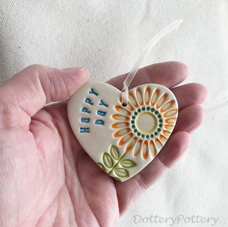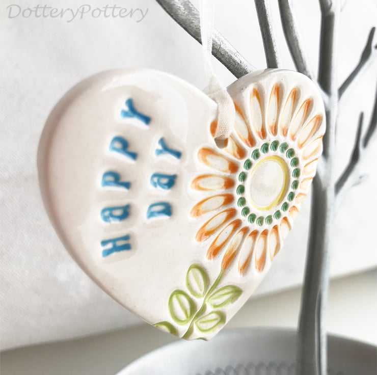 Pottery heart with flower design. This little heart is made from white earthenware clay and decorated with a bright floral design. It has then been fired once, glazed and fired again. It measures 8cm wide x 7 cm high and 1cm deep.