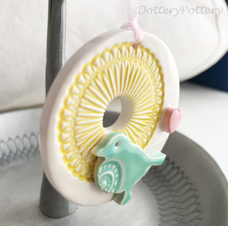 This little decoration is made from white earthenware clay and finshed with a little pottery bird and heart. It has been fired twice and finished with a glossy glaze for a lovely smooth finish. It measures 5.5cm diameter and hangs from a pink organza ribbon.