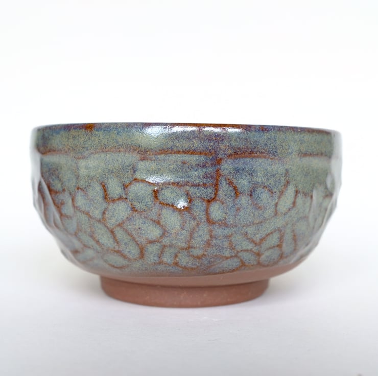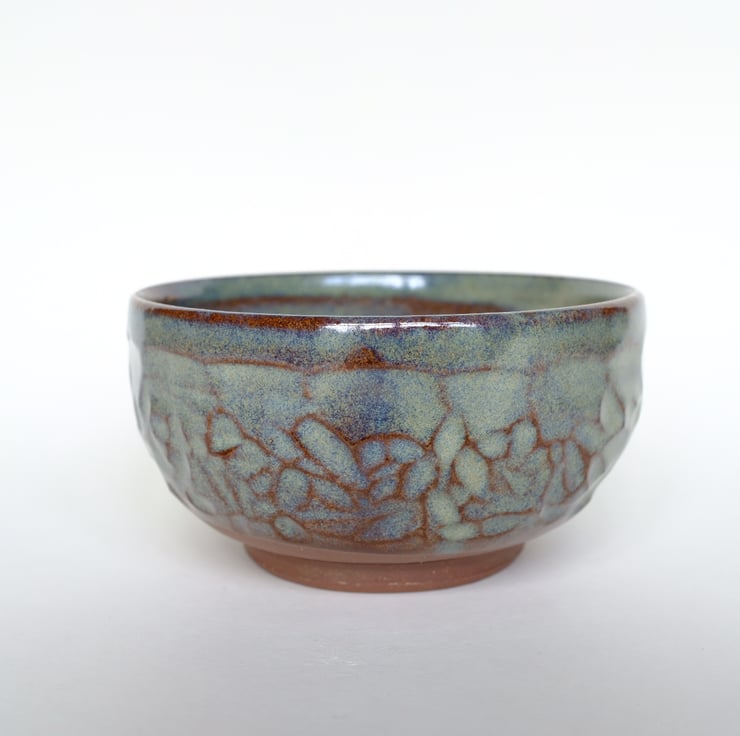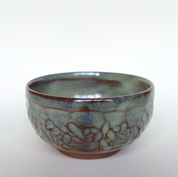 Hand thrown, stoneware bowl with carved pattern, glazed with greeny-blue, on a chocolate brown body. Height: 6.6cm.