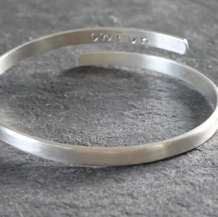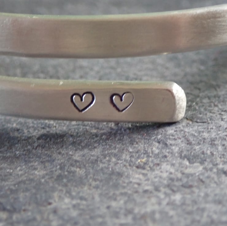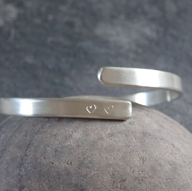 This is an open bangle, made from recycled sterling silver. It has been gently filed to create a soft sheen and lovely tactile finish. I have stamped two little cute hearts on the outside and a hidden "CWTCH" message on the inside.