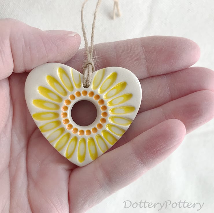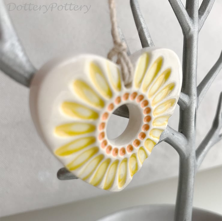 This little heart is made from white earthenware clay and imprinted with a daisy design. It has been fired twice, once to the bisque stage and then a second firing for the clear glaze. It measures 4.5 centimetres wide x 4.5cm height x 5mm thick.