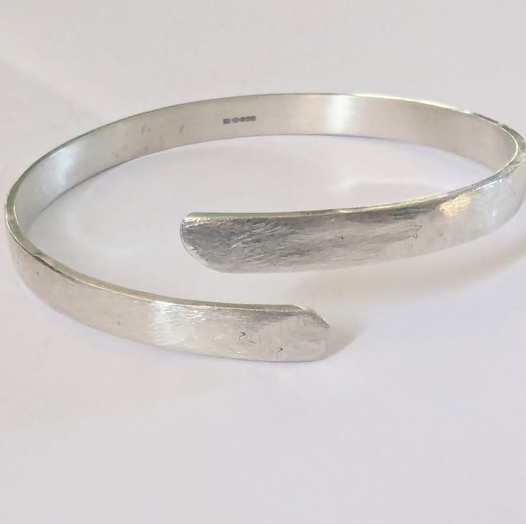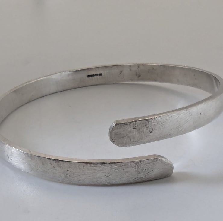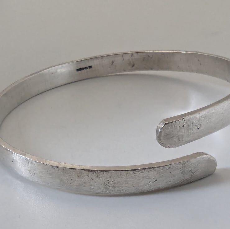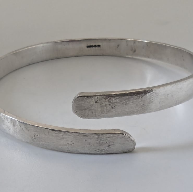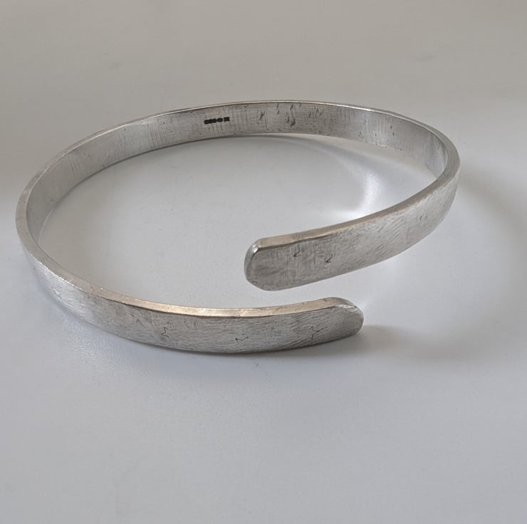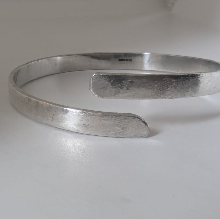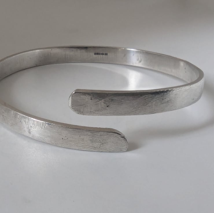 This is a sterling silver cuff style open bangle which has been filed, hammered and polished to create a lovely texture and bright shine. I have hammered it into a round shape, measuring approximately 6cm across.