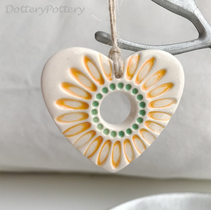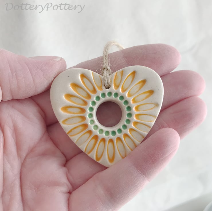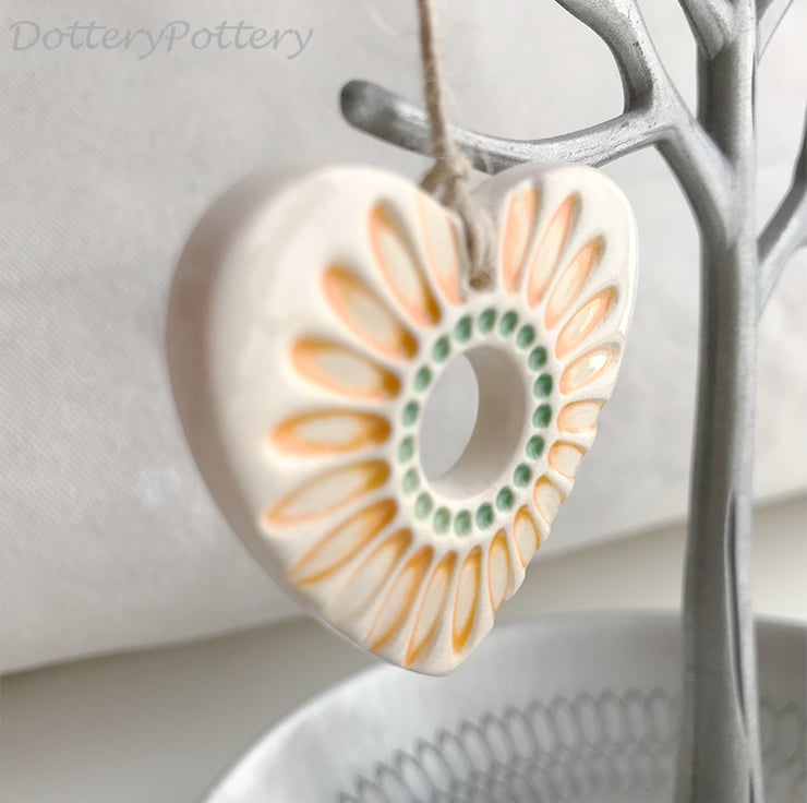 This little heart is made from white earthenware clay and imprinted with a daisy design. It has been fired twice, once to the bisque stage and then a second firing for the clear glaze. It measures 4.5 centimetres wide x 4.5cm height x 5mm thick.