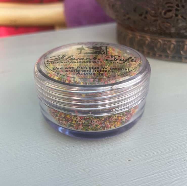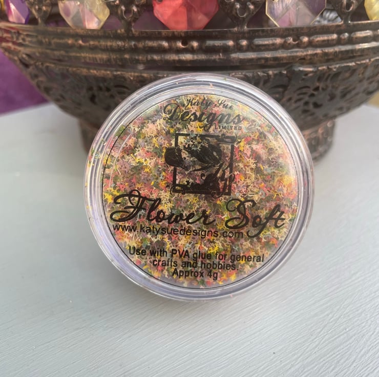 A pot of flower soft in a heather colour, vinrtage looking with yellow, green and pink shades. To be used with PVA glue to decorate papercrafts and scrapbooking. Can also be used to make realistic flowers for dolls houses etc. Acid free.