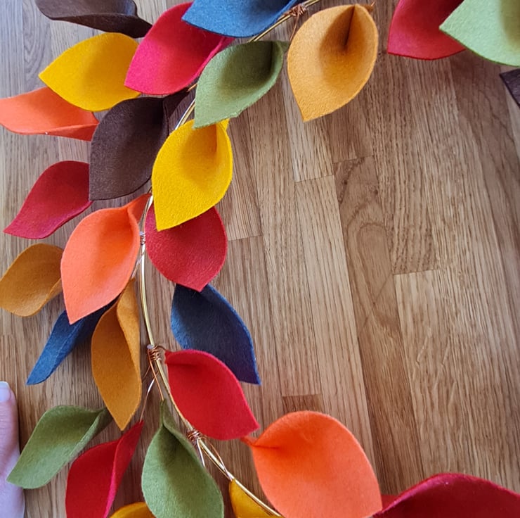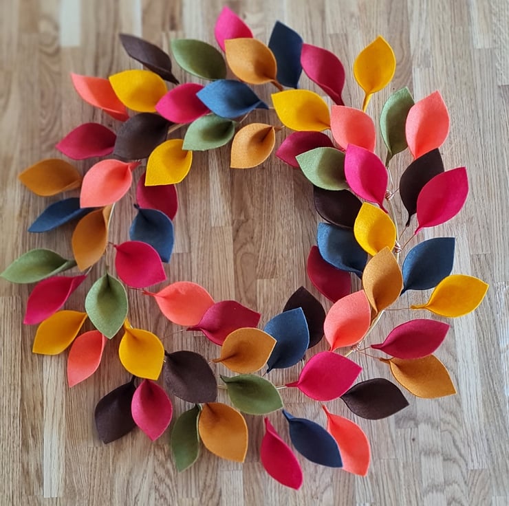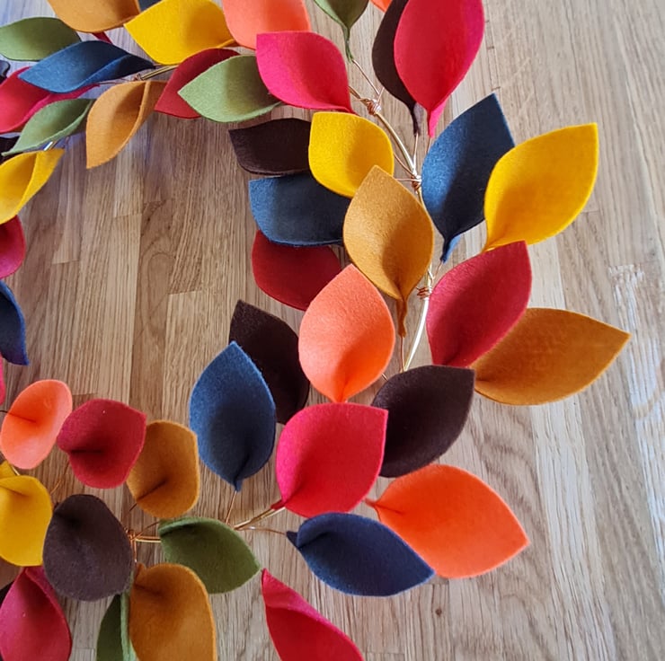This lovely wreath is handcrafted by myself in my North Yorkshire studio. I use high quality wool felt, floristry wire and hot glue to attach each handcut individual leaf.