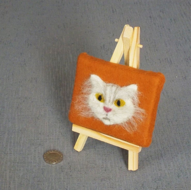 Not a Cheshire cat, but the face of a fluffy long-haired white and grey cat with yellow eyes. I have created this sweet little picture by needle-felting soft fluffy wool onto a wool felt background as though painting with wool. Then the whole has been mounted onto a tiny canvas and frame for support.