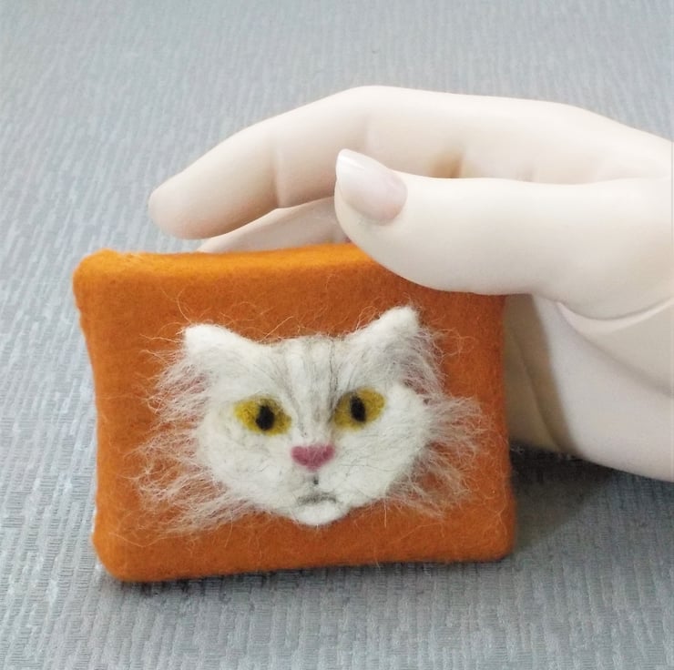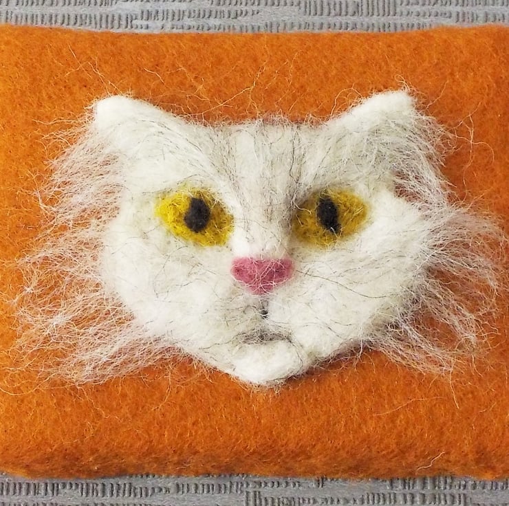 Not a Cheshire cat, but the face of a fluffy long-haired white and grey cat with yellow eyes. I have created this sweet little picture by needle-felting soft fluffy wool onto a wool felt background as though painting with wool. Then the whole has been mounted onto a tiny canvas and frame for support.