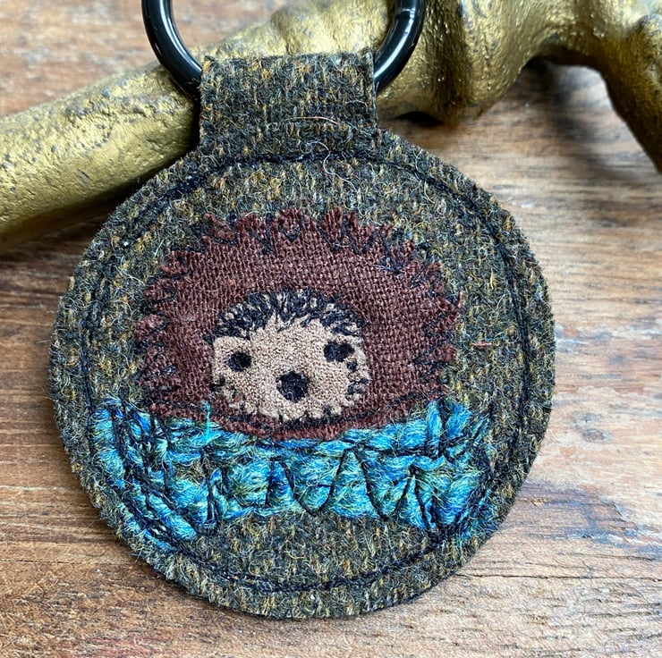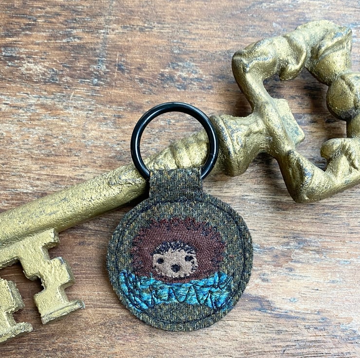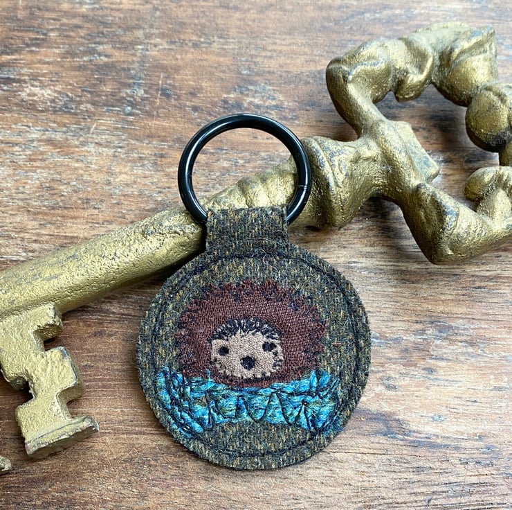 My circular up-cycled wool plaid keyring has a little hedgehog saying hello. It’s plain in the back. It measures 5.5cm diameter. With the ring the length is 8.5cm.