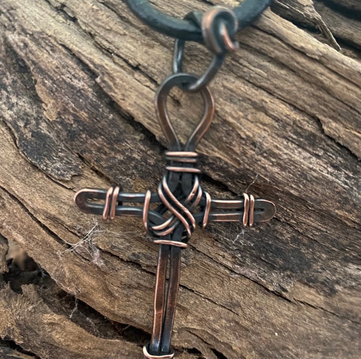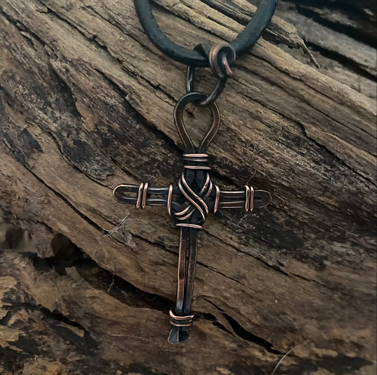 This is a beautifully simple, hand crafted, copper wire wrapped cross. It has been hammered flat and bound with copper before ageing to show off the detail. The bale includes a knoted detail. It measures 64mm from the too of the bale to the bottom and 35mm across at its widest point.