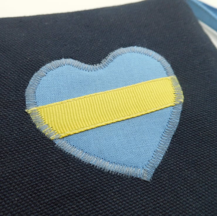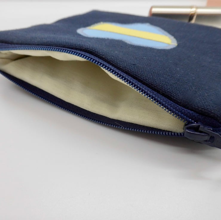 I made this make up bag using a strong navy blue cotton fabric. On the front I have appliquéd a blue heart with a yellow ribbon stripe as a representation of the Ukrainian flag. Lined with pale cream/lemon poly/cotton and in between the two layers is a layer of felt to give the bag body and a quality feel.
