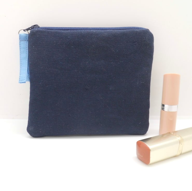 It is a flat style and measures about 15cm x 13cm. There is a navy blue zip across the top, finished with a blue fabric tab which matches the heart.