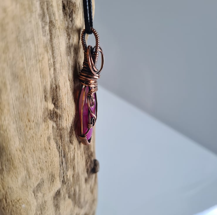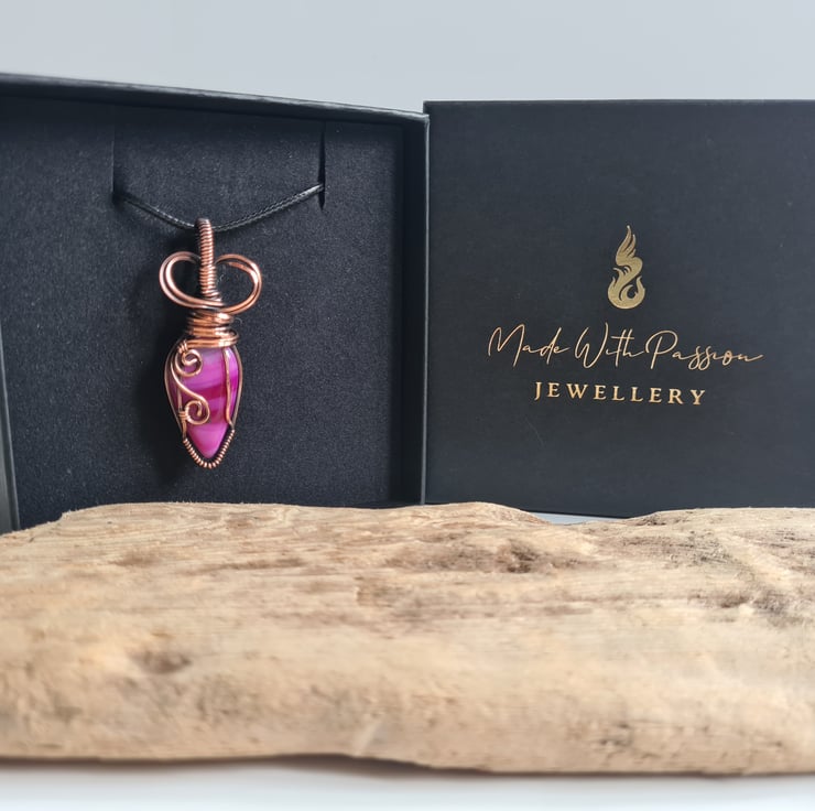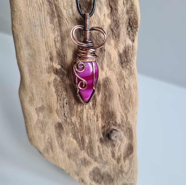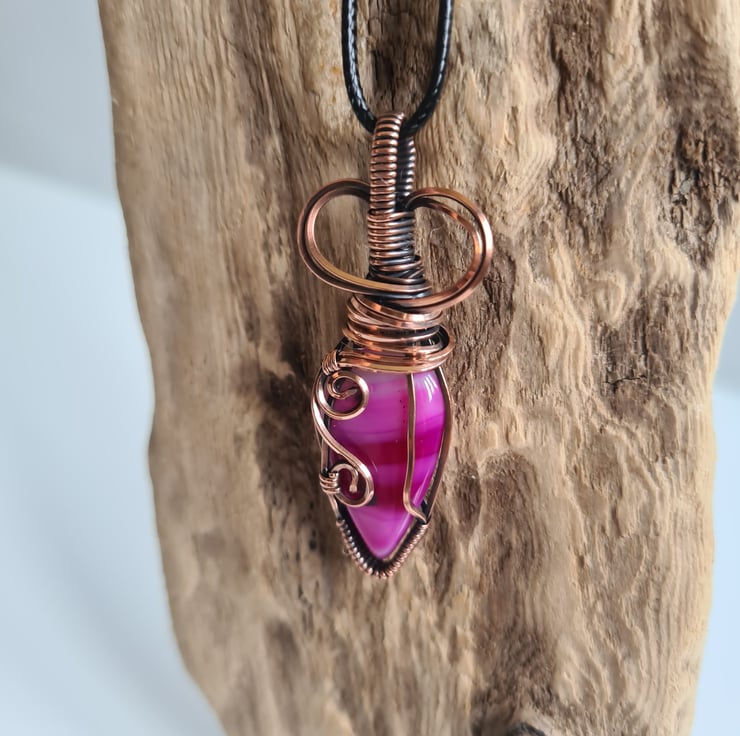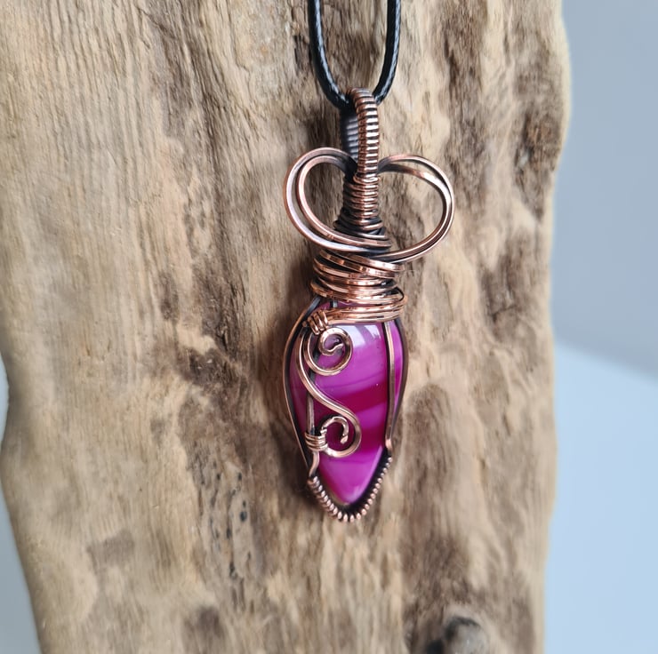 A stunning Natural (dyed) Pink Botswana Agate crystal which I have wrapped in pure copper and then antiqued for the final effect.