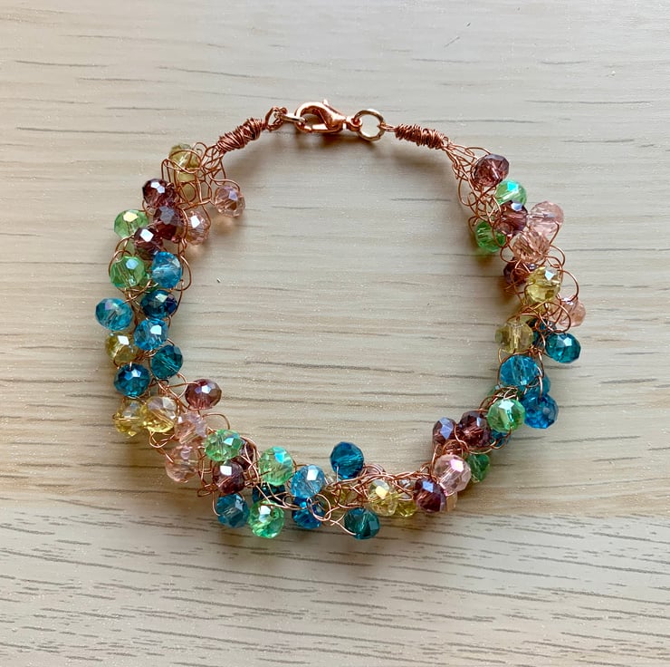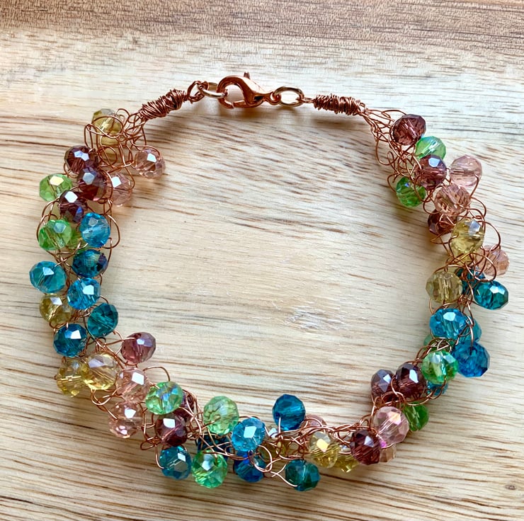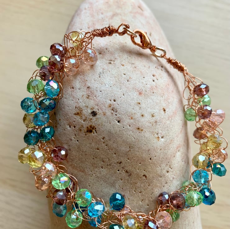 Unusual design wire crystal bracelet crochet technique using copper wire and beautiful crystals, hand wire wrapped, rose gold plated lobster catch. The copper wire provides a perfect media to carry these gorgeous multi coloured bicone crystals, giving a sea foam effect. This bracelet will easily fit up to and 8inch (21cm) wrist size.