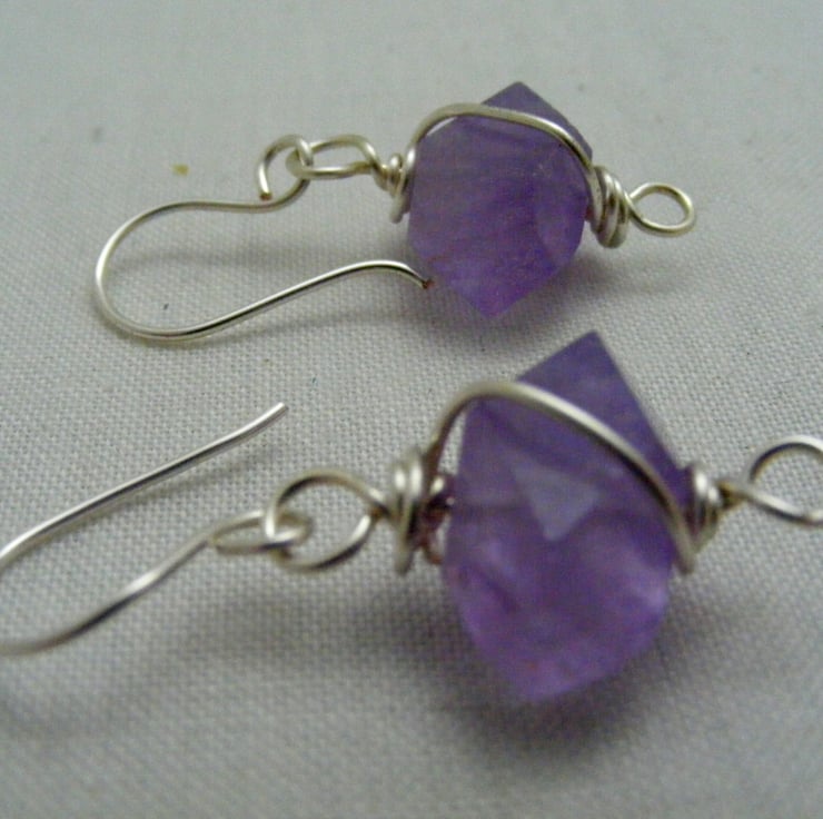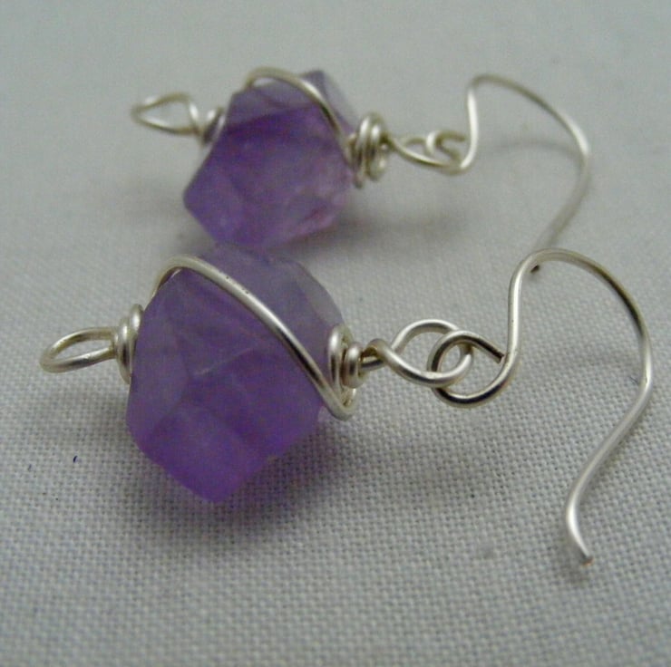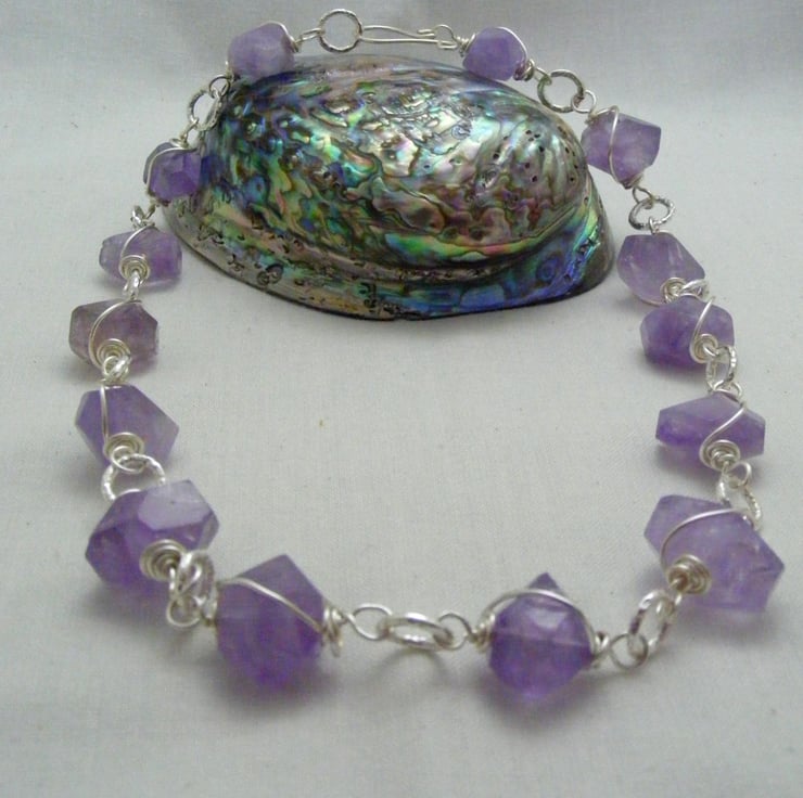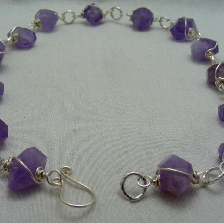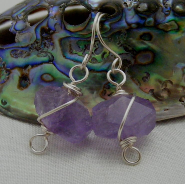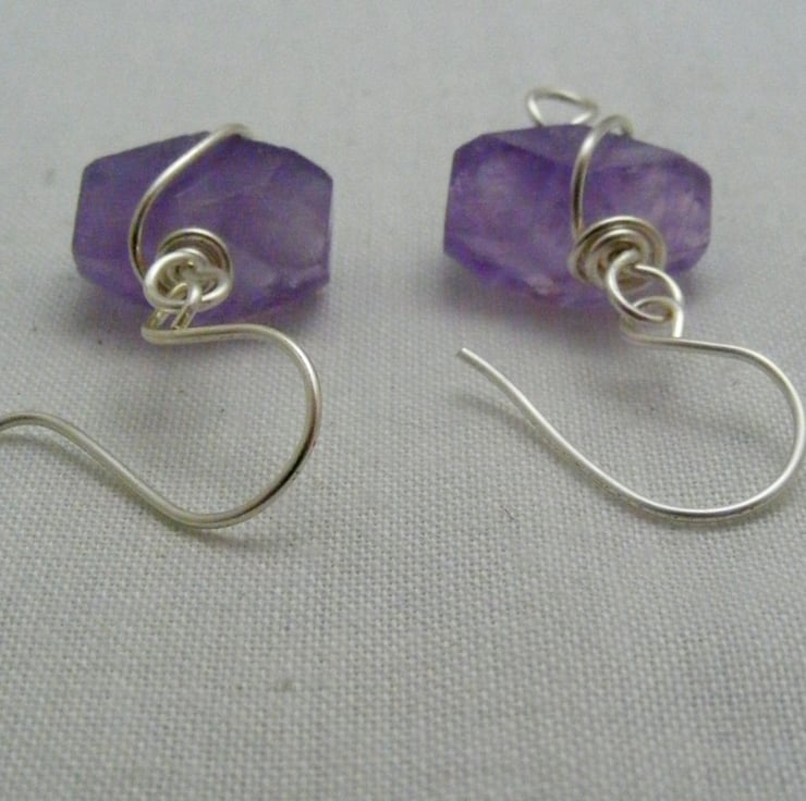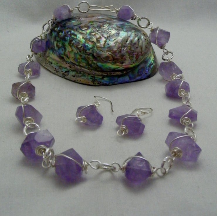 Jewellery set includes a necklace and earrings. Set is handmade with, irregular lavender amethyst gemstone nuggets, silver plated wire, patterned jump rings and handmade clasp and ear wires. Wire used is hypo allergenic and resistant to tarnishing.