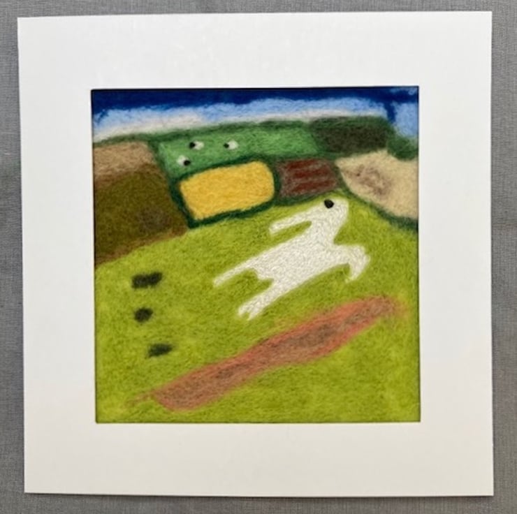 The white horse of Westbury in Wiltshire. This aerial view of the magical white horse on the escarpment of Salisbury Plain with the distant fields has been created using needle felting & hand embroidery. I have hand embroidered the white horse & needle felted the surroundings onto linen and felt. The picture has been surrounded with mounting board to create a little piece of art which measures 19.5cm x 20 cm. The back of the picture has been covered with beige linen. You could hang the picture up with a picture hook is or frame it in a glass frame of your own. The colours may vary slightly due to photography.
