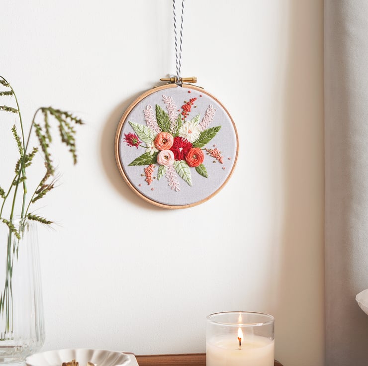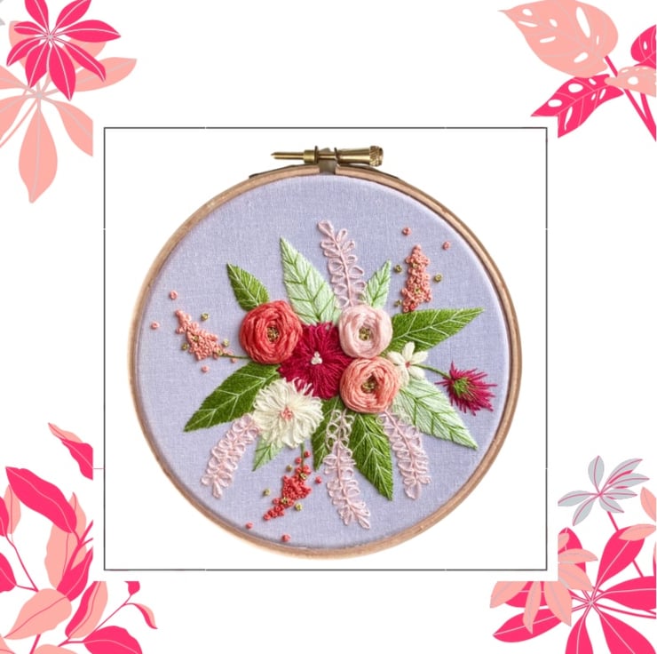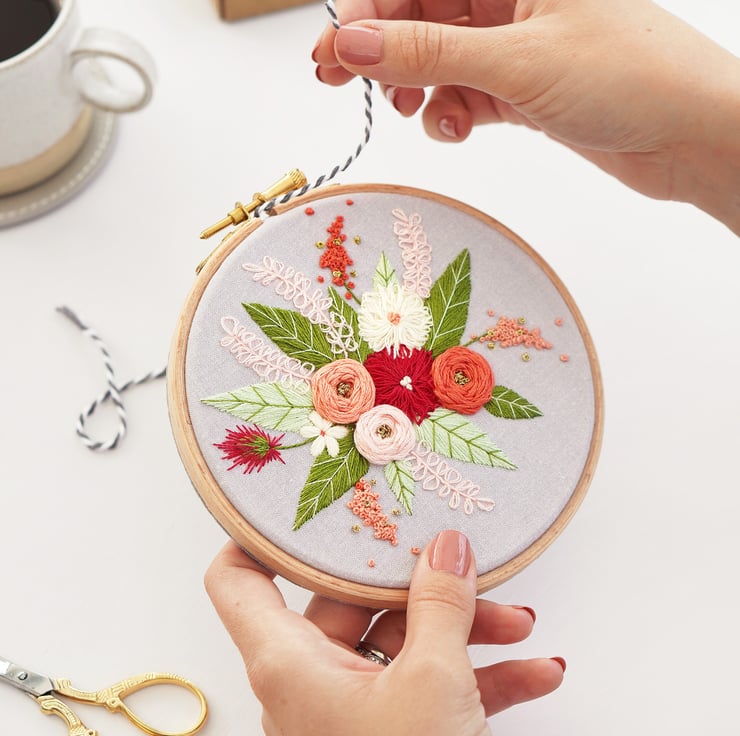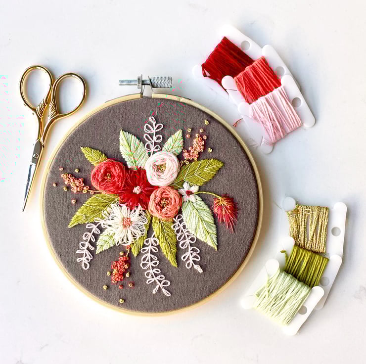 Whether you are a complete beginner or have past experience in hand embroidery, this kit will walk you through 8 common hand embroidery stitches whilst you create a beautiful 5" embroidery hoop wall hanging. Create this gorgeous floral design while learning a new skill or perfecting your existing talent.