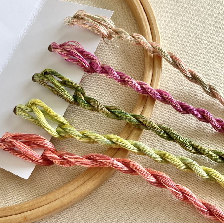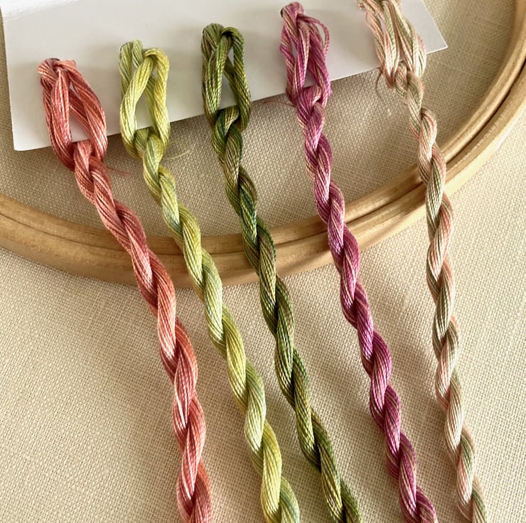 Wild roses blooming in an English summer inspire this collection of fine perle 16 variegated threads for hand embroidery.