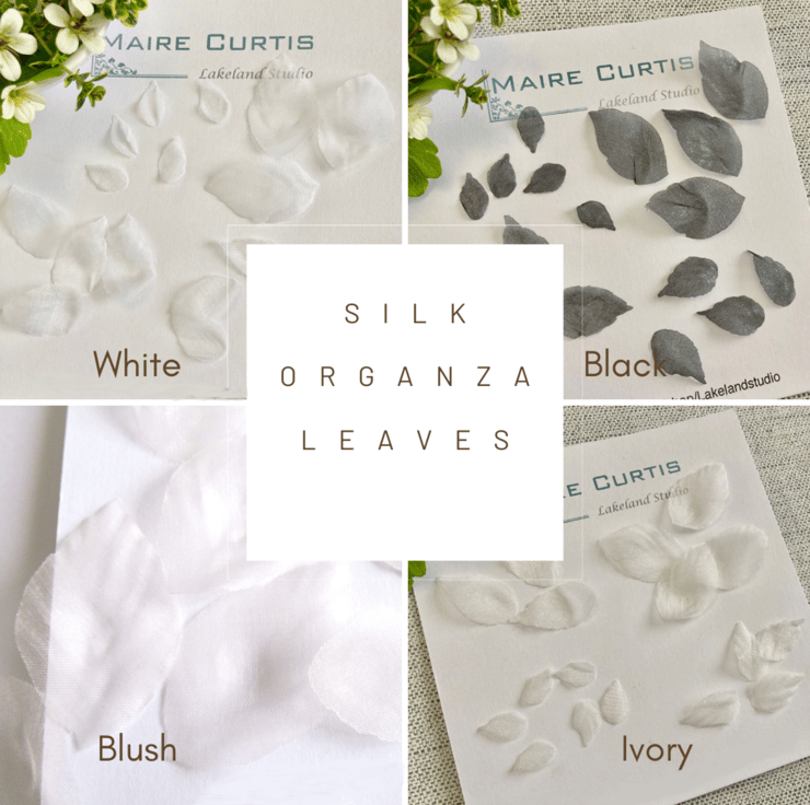 High quality silk satin is stiffened and then cut and hand shaped using Japanese Somebana techniques to create these gorgeous, delicate leaves.