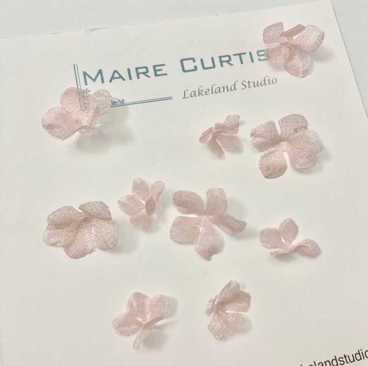 Hand crafted couture silk organza apple Blossom petals in stunning metallic Silver Pink.