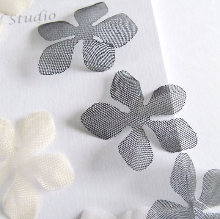 High quality silk organza is stiffened and then cut and hand shaped using Japanese Somebana techniques to create these gorgeous, delicate flowers.