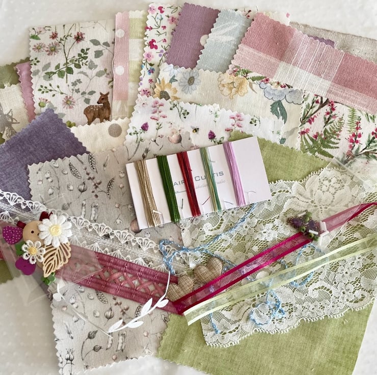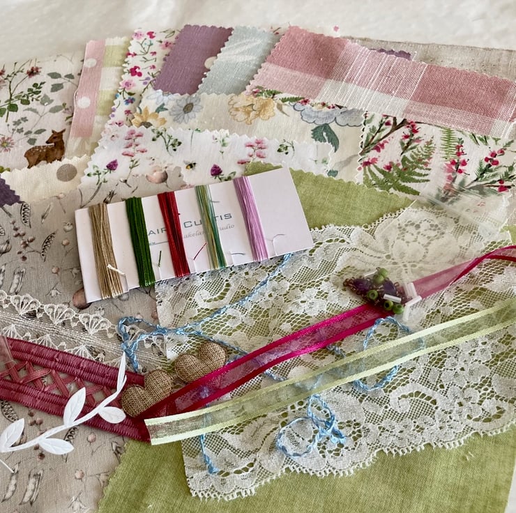 All of the trims and ribbons are new, sourced especially for the kit and these can include silk ribbon, lace and themed embellishments.