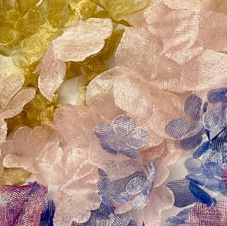 Our couture designers were requesting metallic silk flowers and it has taken us almost a year to source the perfect silk and perfect the processing of this unique but difficult fabric.