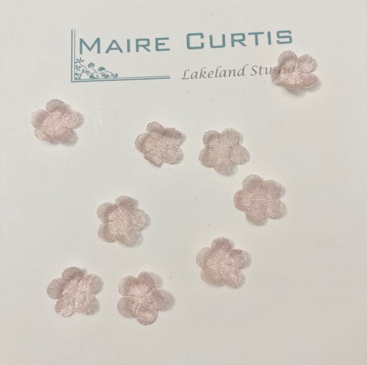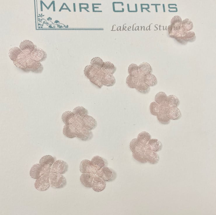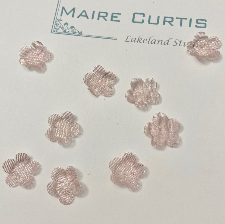 Hand crafted metallic organza Forget me not flowers in shimmering silver pink. Available in packs of 25 or 100.