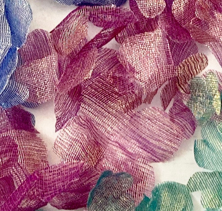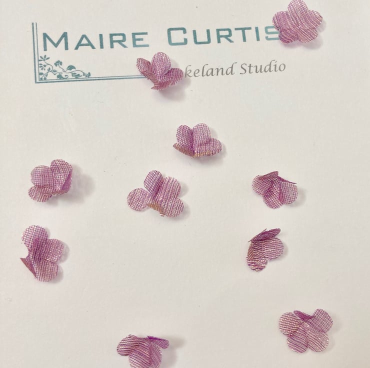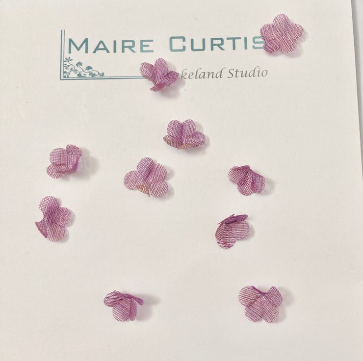 Hand crafted Silk Mayflowers available in a stunning metallic violet gold organza. Four sizes, available in packs of 25 or 100.