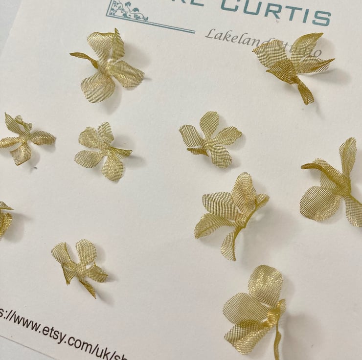 High quality metallic silk is stiffened and then cut and hand shaped using Japanese Somebana techniques to create these gorgeous, delicate flowers.