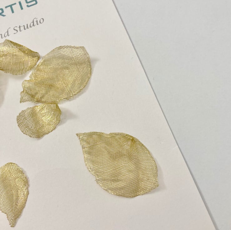 High quality metallic silk is stiffened and then cut and hand shaped using Japanese Somebana techniques to create these gorgeous, delicate leaves.