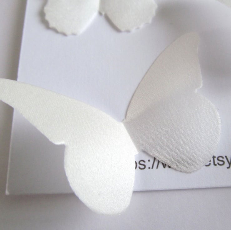 25 couture butterflies in two different sizes made from pure silk satin. Select from white, Ivory, Blush and Black