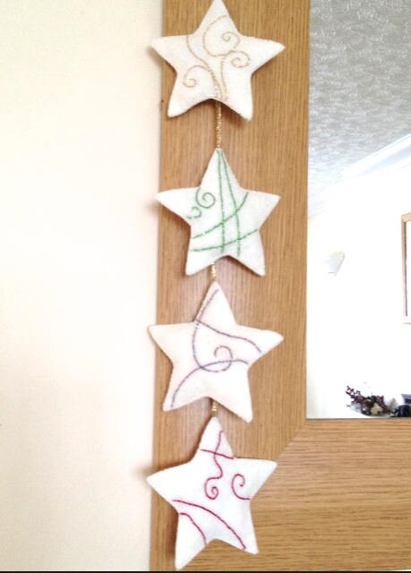 A simple split stitch is used to embroider each star and once embroidered, the pieces are put together with the wadding and sewn using a small blanket stitch.