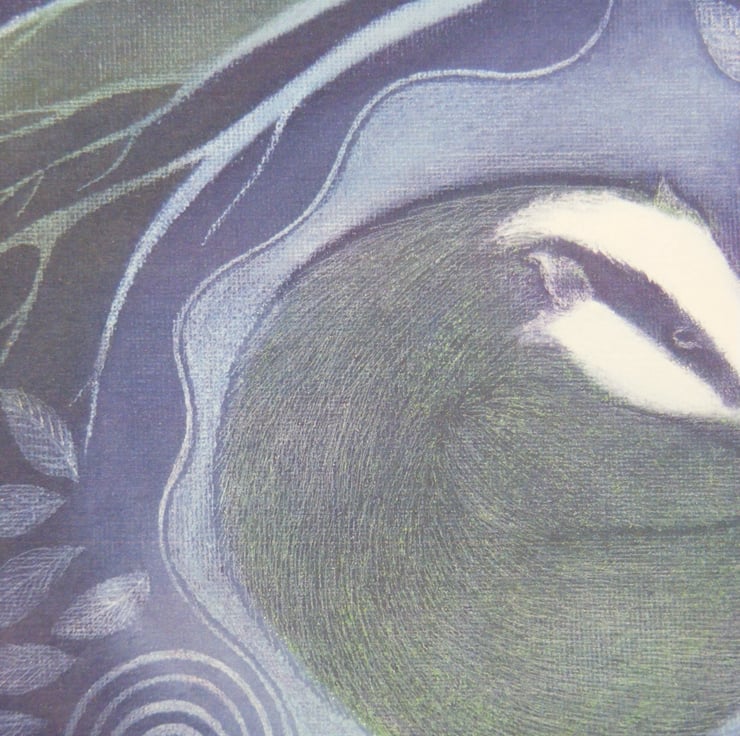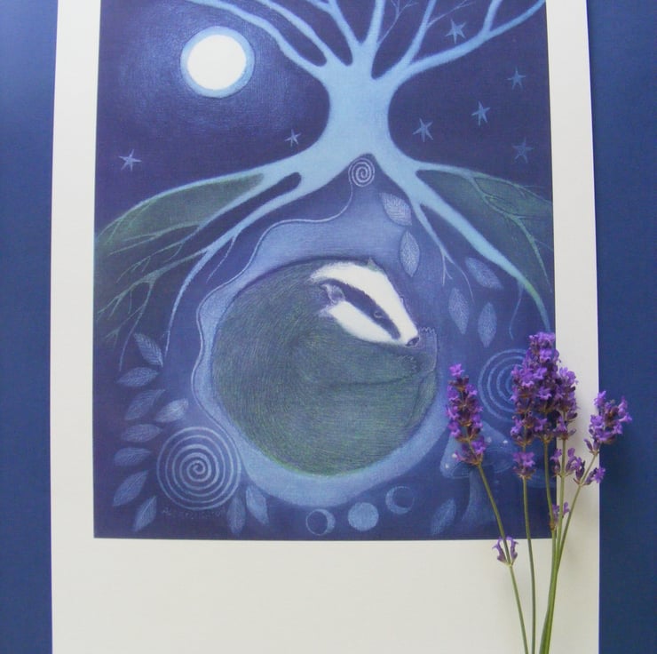 Everyone needs a Safe Haven, away from the world and her noise, a place of peace where they can heal and restore. Inspiration for A Safe Haven was born from a desire to hibernate away from the pressures of todays world and go inwards, in a deep safe place. I felt the Badger very much needed this too as he connects with the roots of the Earth and sleeps peacefully and safely. He stays connected with the world through the spirals that surround him and reach up through the trunk of the Oak tree through the branches to the Full moon and the twinkly starry sky. A beautiful companion piece to the Dreamtime Hare print.