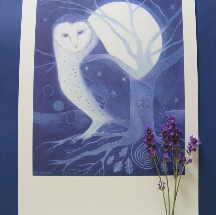 A Magical Knowing continues the magical and mystical theme of the dreamtime hare and a safe haven prints. Together all three pieces became entwined as the magic of the earth and the full moon weaved creatively through them. The all knowing mystical Barn Owl perches on the roots of the Oak tree as her leaves lay around, the light from the Full Moon bathes over the delicate Barn Owl giving her an ethereal appearance. From here she peers out at us with an all knowing gaze, her connections from the earth to the sky, deep, mystical and magical.