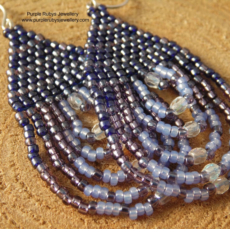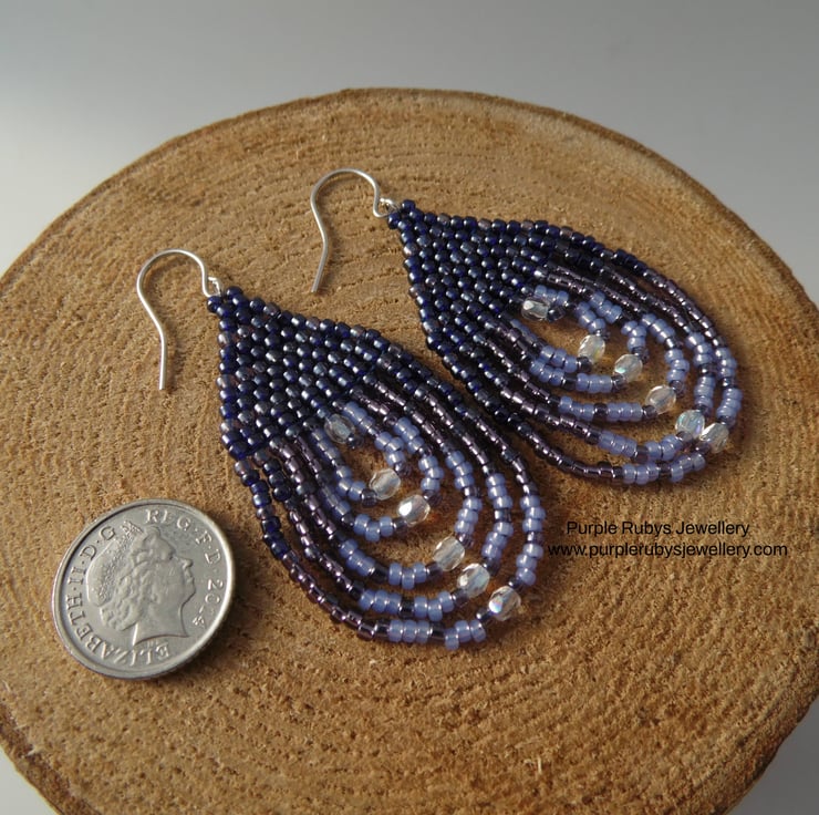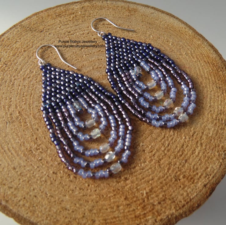 Beautiful hand beaded teardrop earrings in rich deep blue lustre, purple lustre & lilac with clear Aurora central beads; these beautiful statement earrings are lightweight & so swishy!