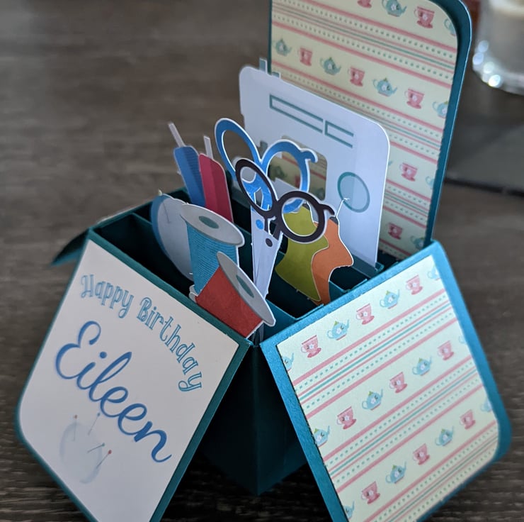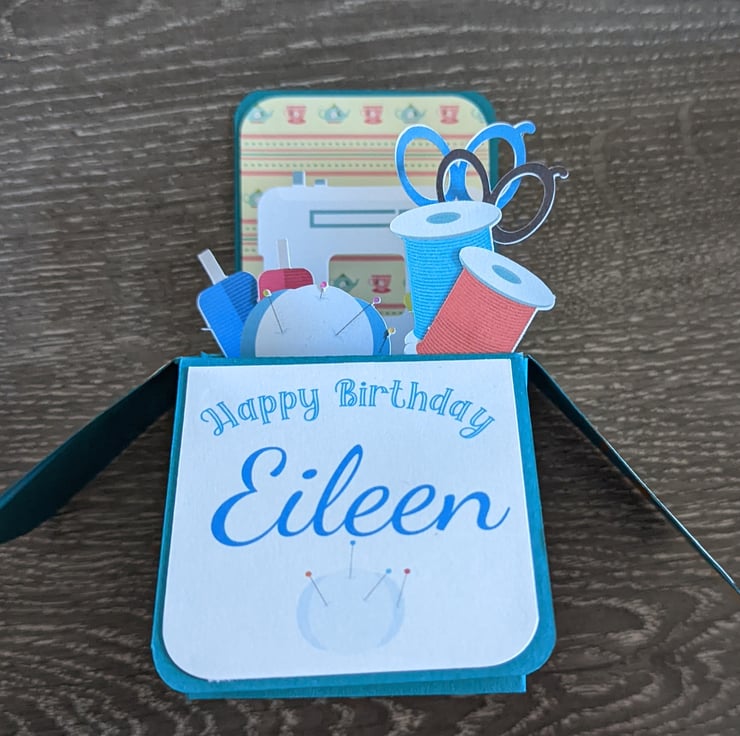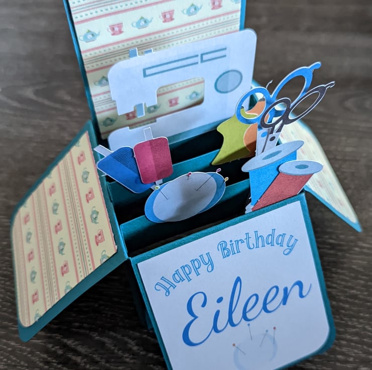 This box card measures 14cm x 14 cm when laid flat and fits in the envelope provided. The card base is teal in colour and is topped with coordinated paper. The card is embellished with sewing images, scissors, thread bobbins, sewing machine and a pin cushion. The front panel of the card reads "Happy Birthday Eileen", this will default to "Happy Birthday".