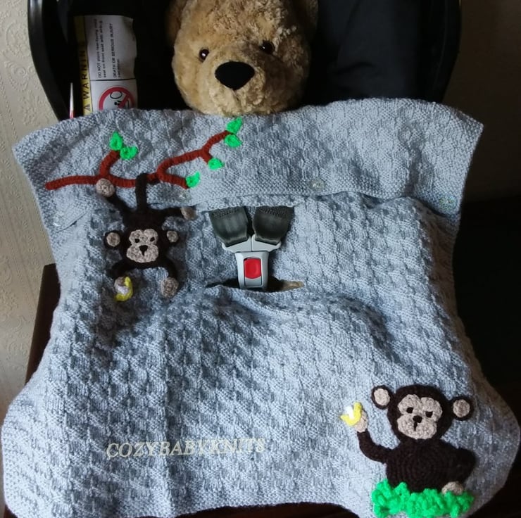 My niece was expecting her first baby so I decided to make a blanket to match her car seat. I put two holes in the blanket for the harness to go through which means when carrying the car seat the blanket is secure.