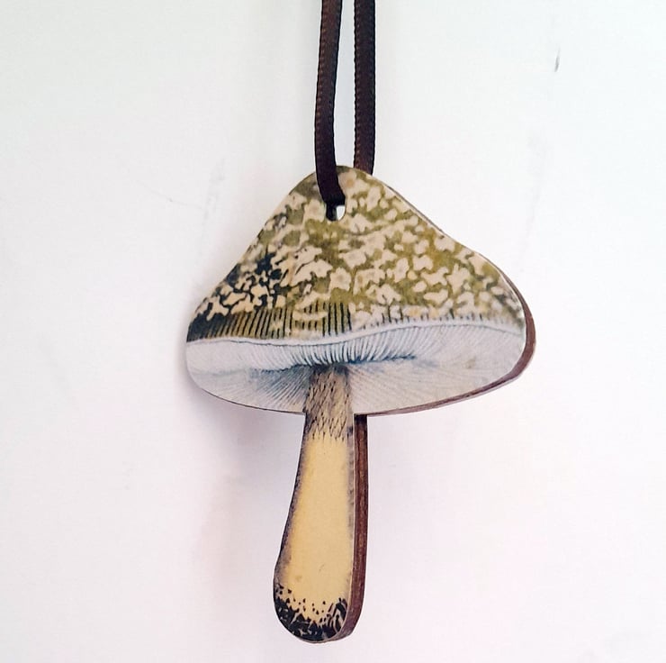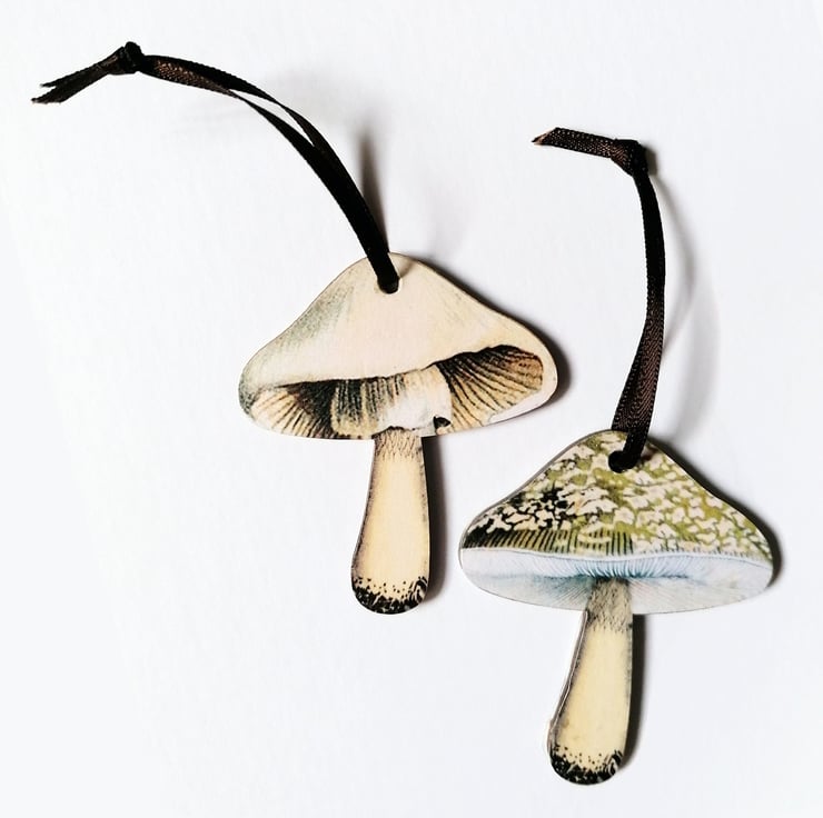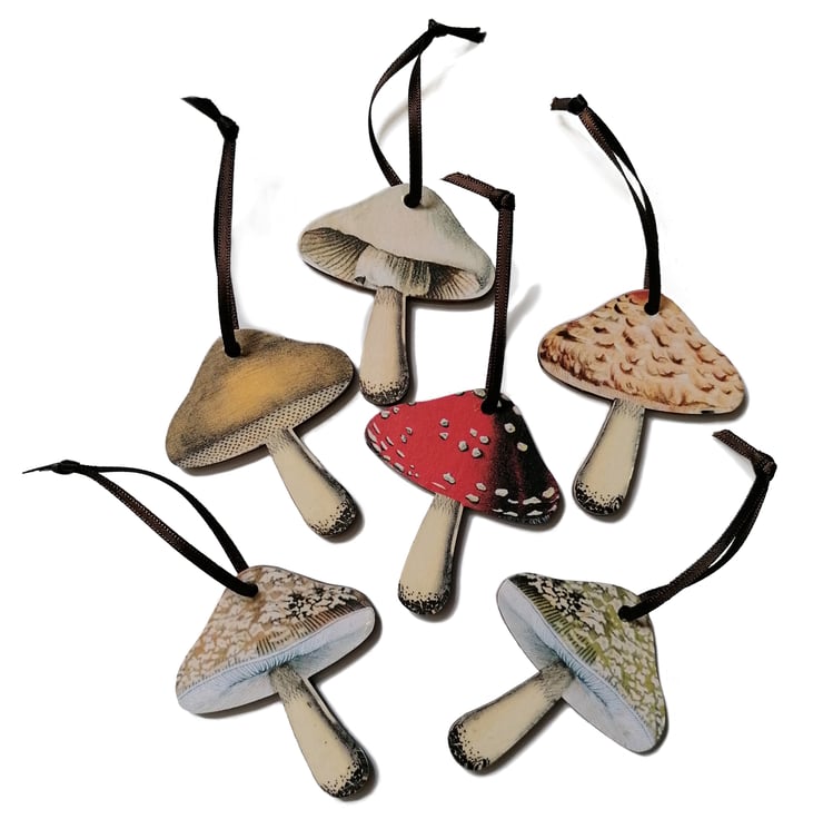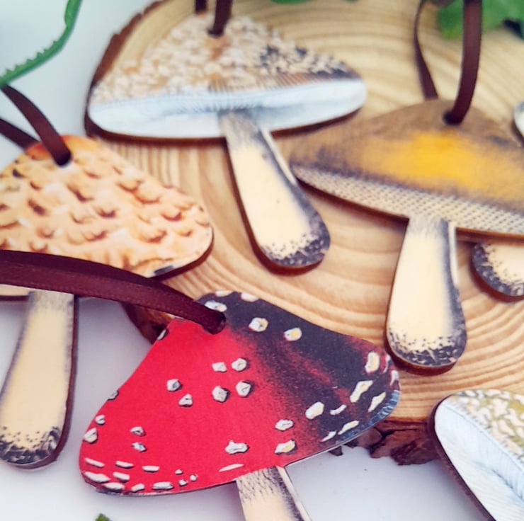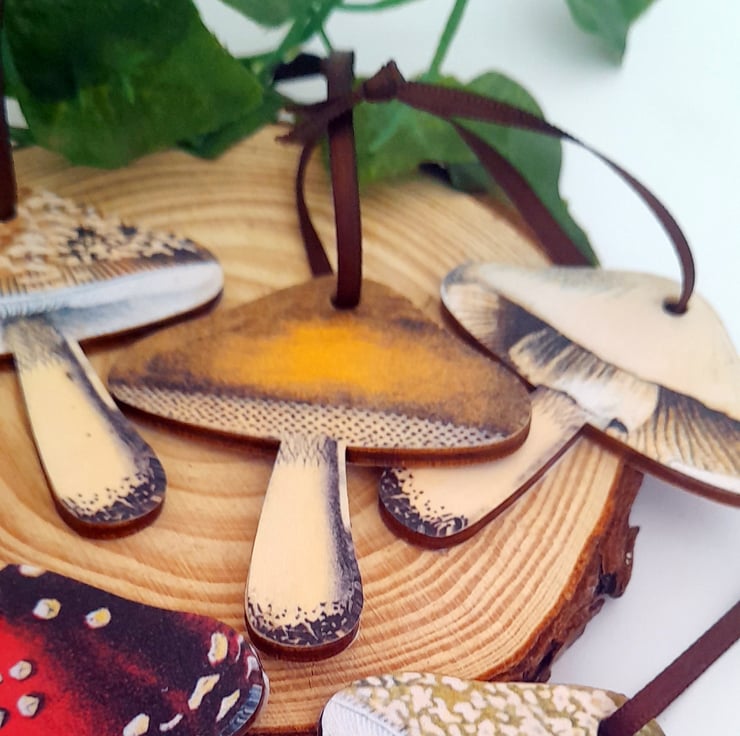 Each decoration in the set features a different mushroom, and is strung with satin ribbon in a deep chocolate brown to compliment the dark wooden edge of each piece. They have been finished with several coats of matt sealant to protect the design.